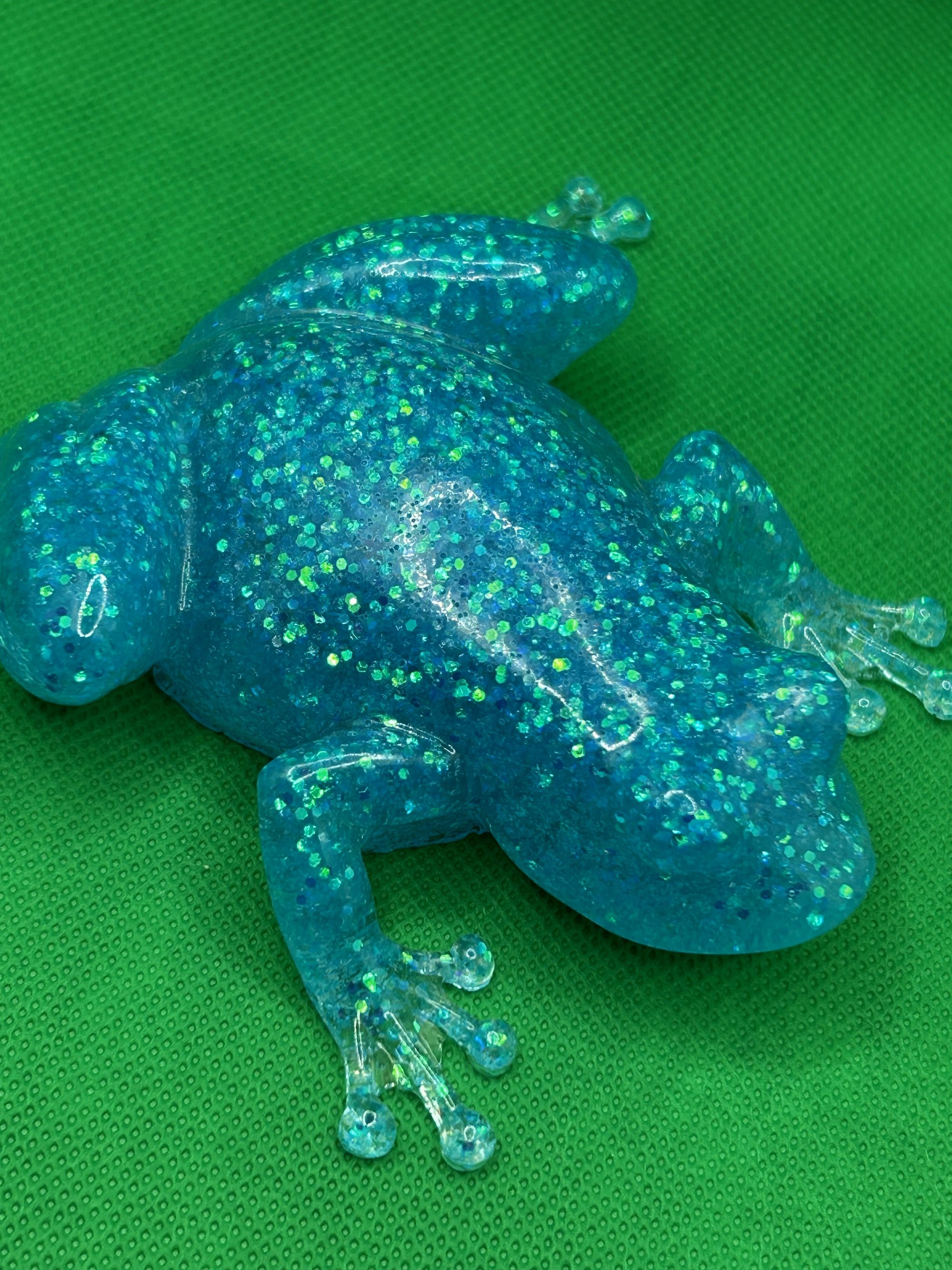 The Azure Sparkle Hopper is a charming resin frog figurine cast in vibrant ocean-blue resin and infused with shimmering glitter that catches the light beautifully. Its smooth, glossy finish and playful pose highlight fine details like webbed toes and rounded contours, giving it a whimsical yet polished look. This little frog feels magical—almost like a creature from a fairy pond—and makes a delightful accent for shelves, desks, terrariums (decorative only), or gift displays.