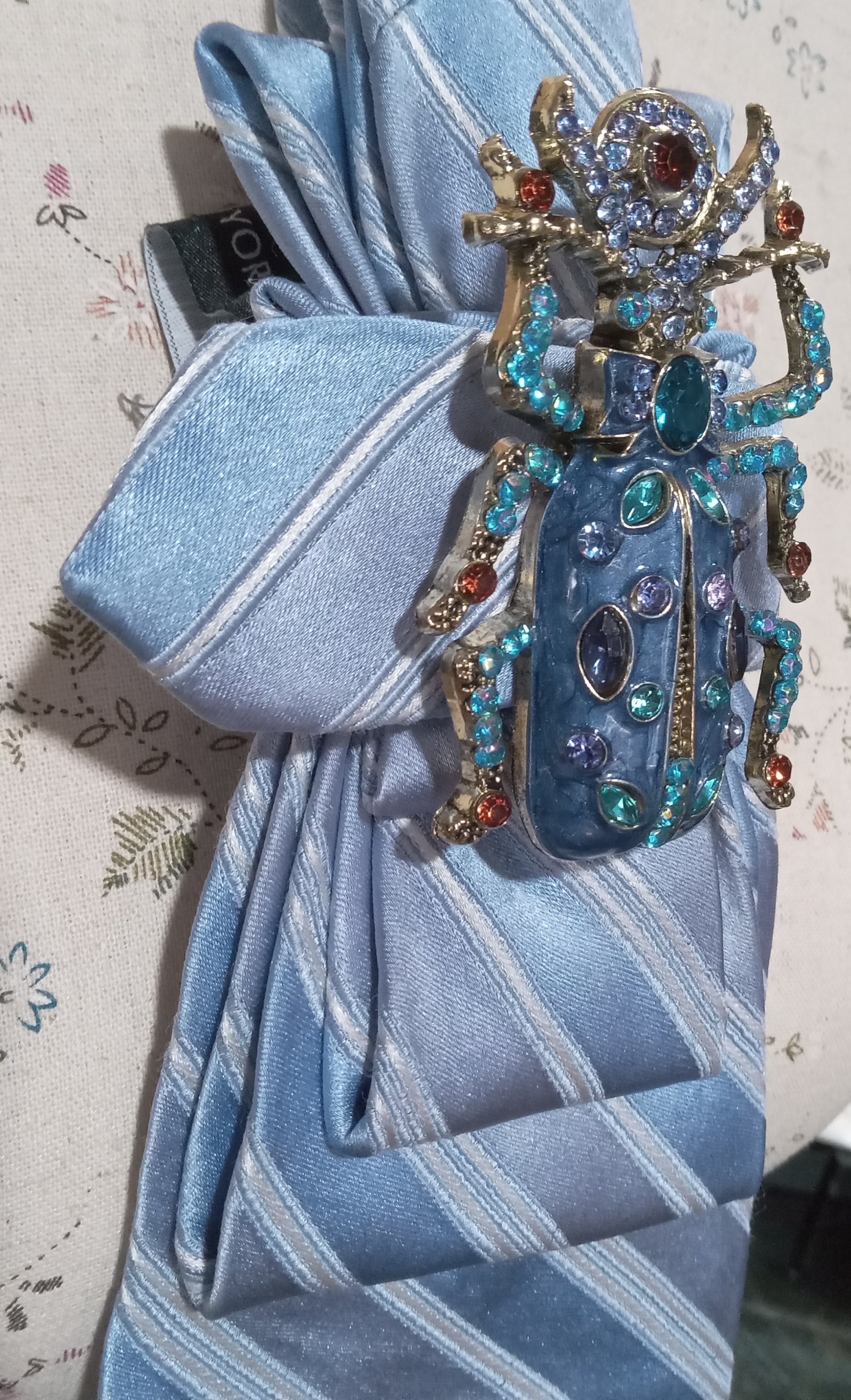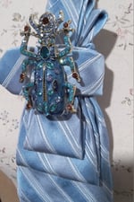 A soft blue striped necktie crowned with a dazzling crystal insect brooch and anchored by a bold gold chain (chain not included). This design blends classic tailoring with avant-garde adornment, creating a timeless yet fearless accessory for the modern matriarch.