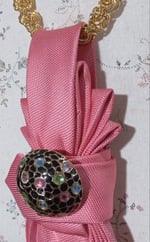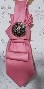 A textured rose-pink blush necktie featuring a dramatic circular brooch with multicolored crystals set in a black lattice design. Romantic yet edgy, this piece speaks to strength wrapped in softness-where femininity meets unapologetic style.