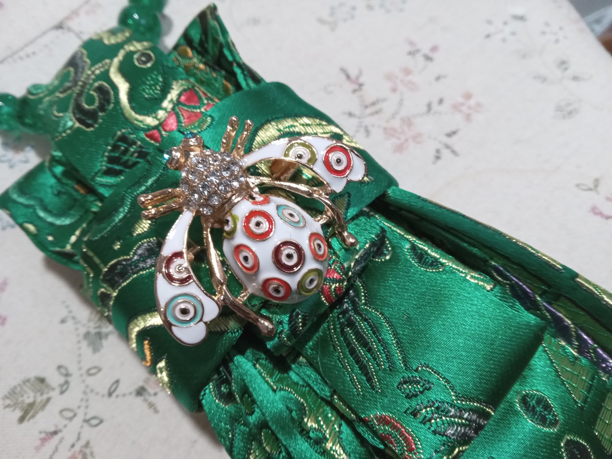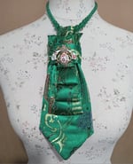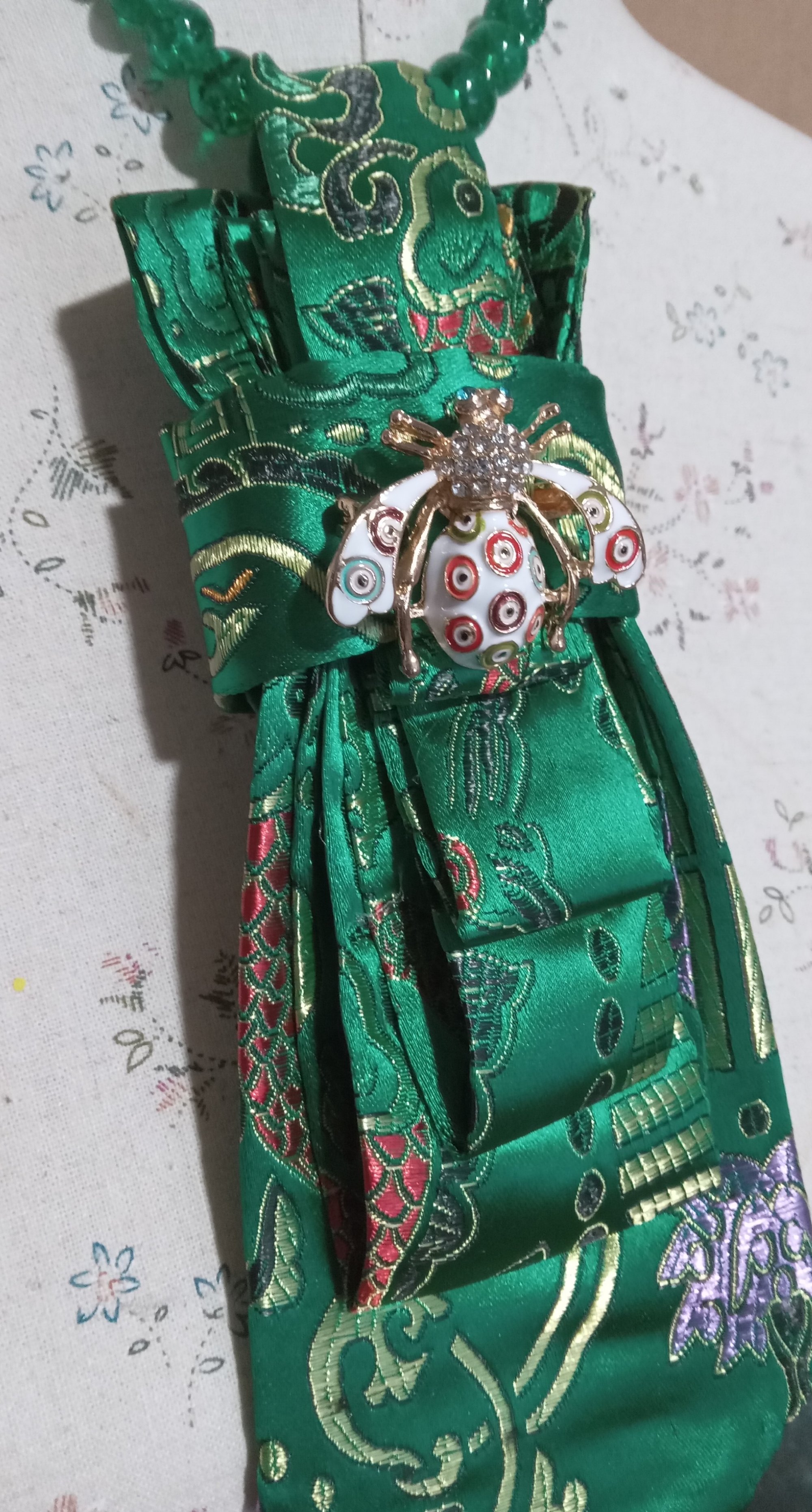 An opulent emerald brocade necktie adorned with an ornate beetle-inspired brooch and matching green meaded chain, (chain sold separately). Gold threads shimmer through the fabric, giving this piece an old-world luxury feel with modern artistic flair. A true heirloom statement.