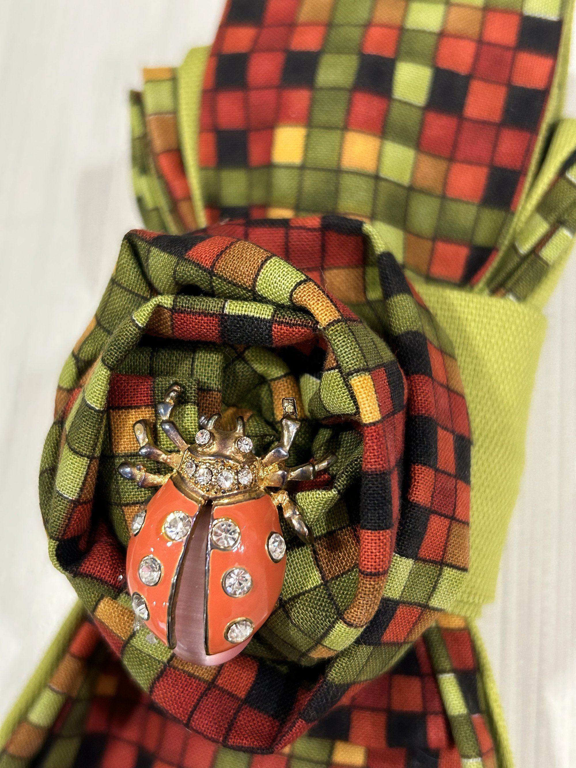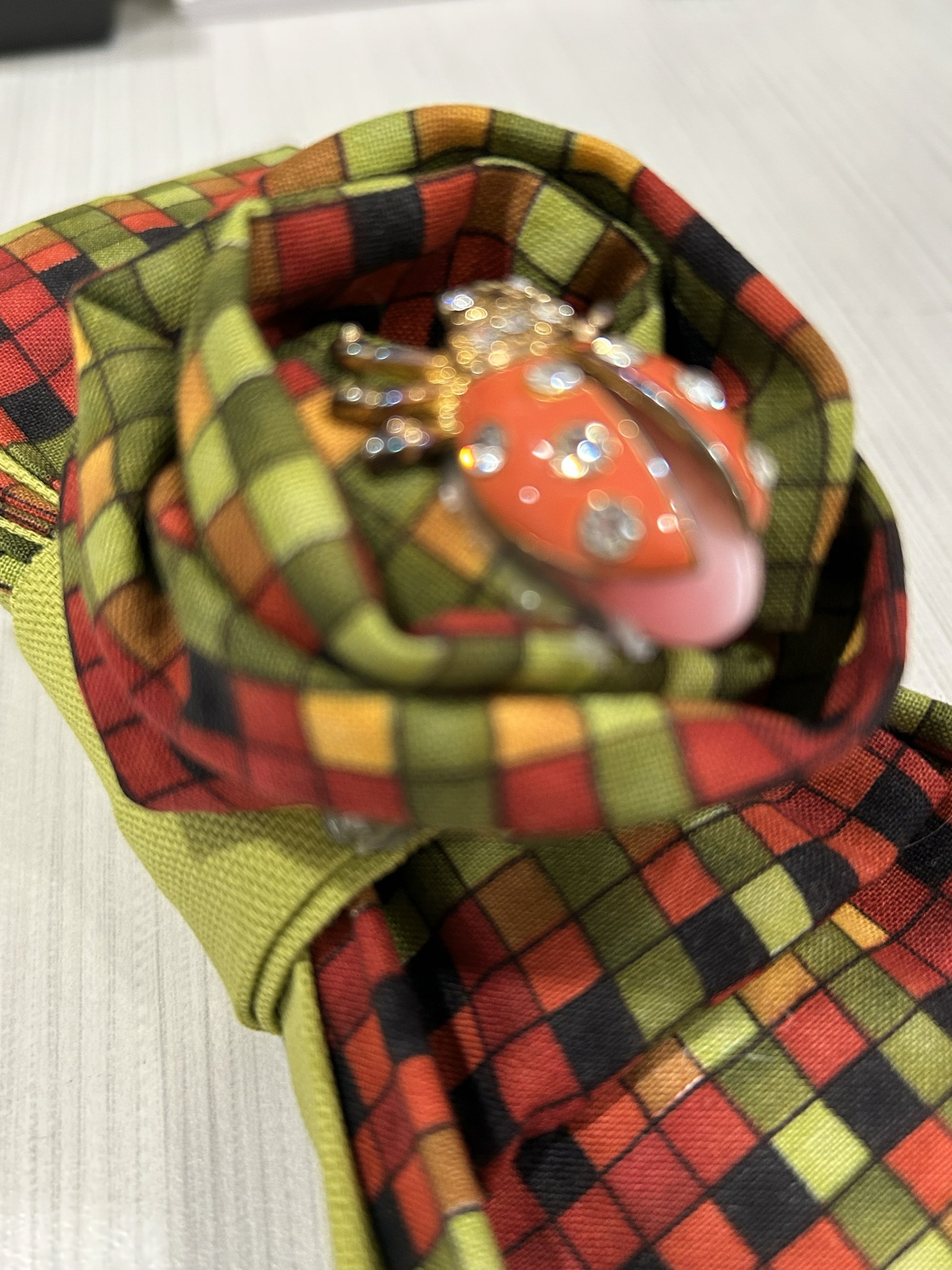 Handcrafted with care and intention, Lady of Good Fortune features a rich mosaic of green, red, gold, and black-colors long associated with growth, protection, vitality, and resilience. The structured folds reveal layered depth, while the vibrant ladybug adornment brooch sits as the center as a symbol of luck, renewal, and divine favor.