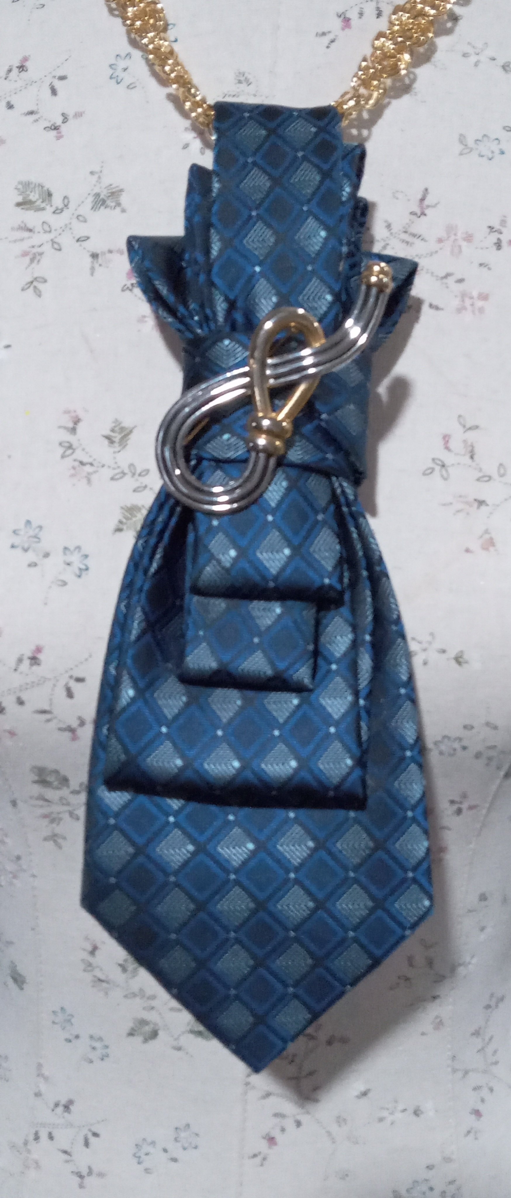A structured sapphire-blue tie with geometric texture, anchored by a sculptural gold-and-silver clasp. This is authority without theatrics. Boardroom energy with after-hours mystery.