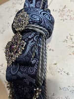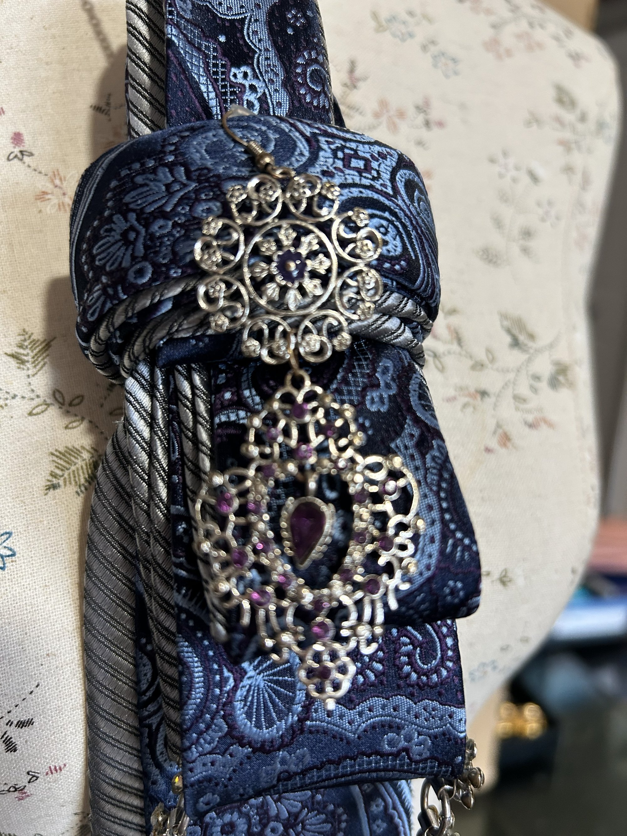 Elegant and richly detailed, Midnight Heirloom is a luxurious statement piece crafted from a deep navy paisley tie with layered textures and ornate silver-tone embellishments. Featuring intricate filigree accents, a purple gemstone focal point, and draped chain detailing, this piece evokes old-world charm with a modern edge.