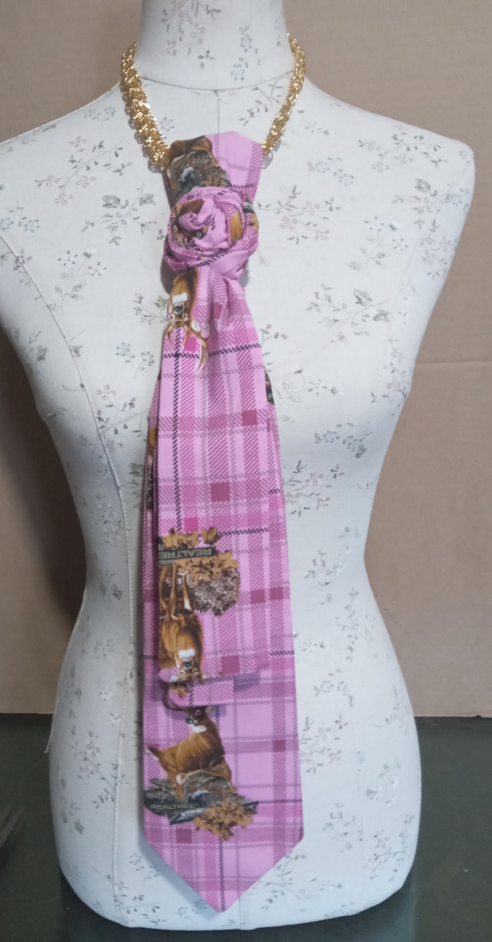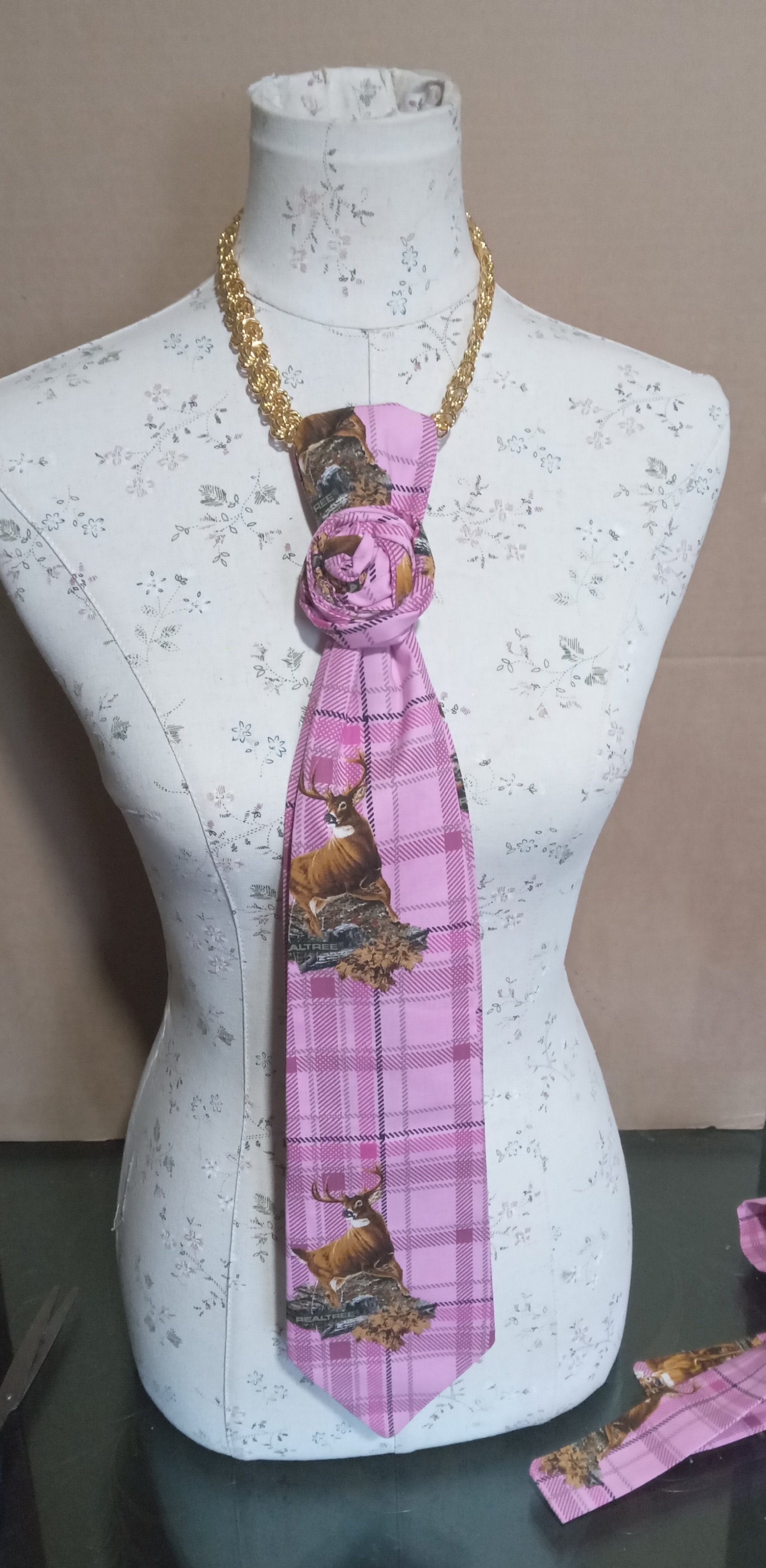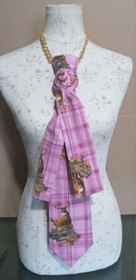 A blush plaid tie featuring vintage-style imagery. Feminine color meets ancestral strength. This piece plays with contrast, softness and sovereignty, grace and instinct. Perfect for the woman who understands that elegance and power are not opposites.