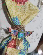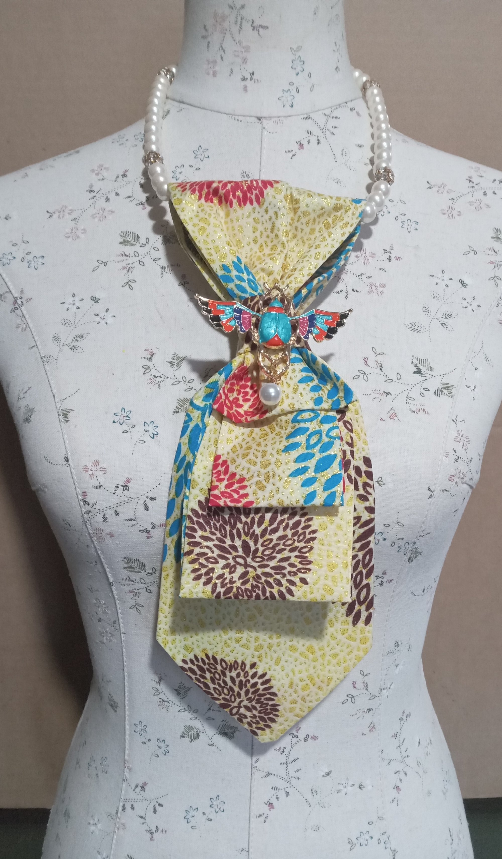 A light, celebratory necktie handcrafted from a patterned fabric in warm ivory, gold, turquoise, yellow and coral tones. Finished with a winged scarab-style brooch and pearl accents, this piece radiates joy, creativity, and spiritual elegance-ideal for daytime sophistication or artistic gatherings,