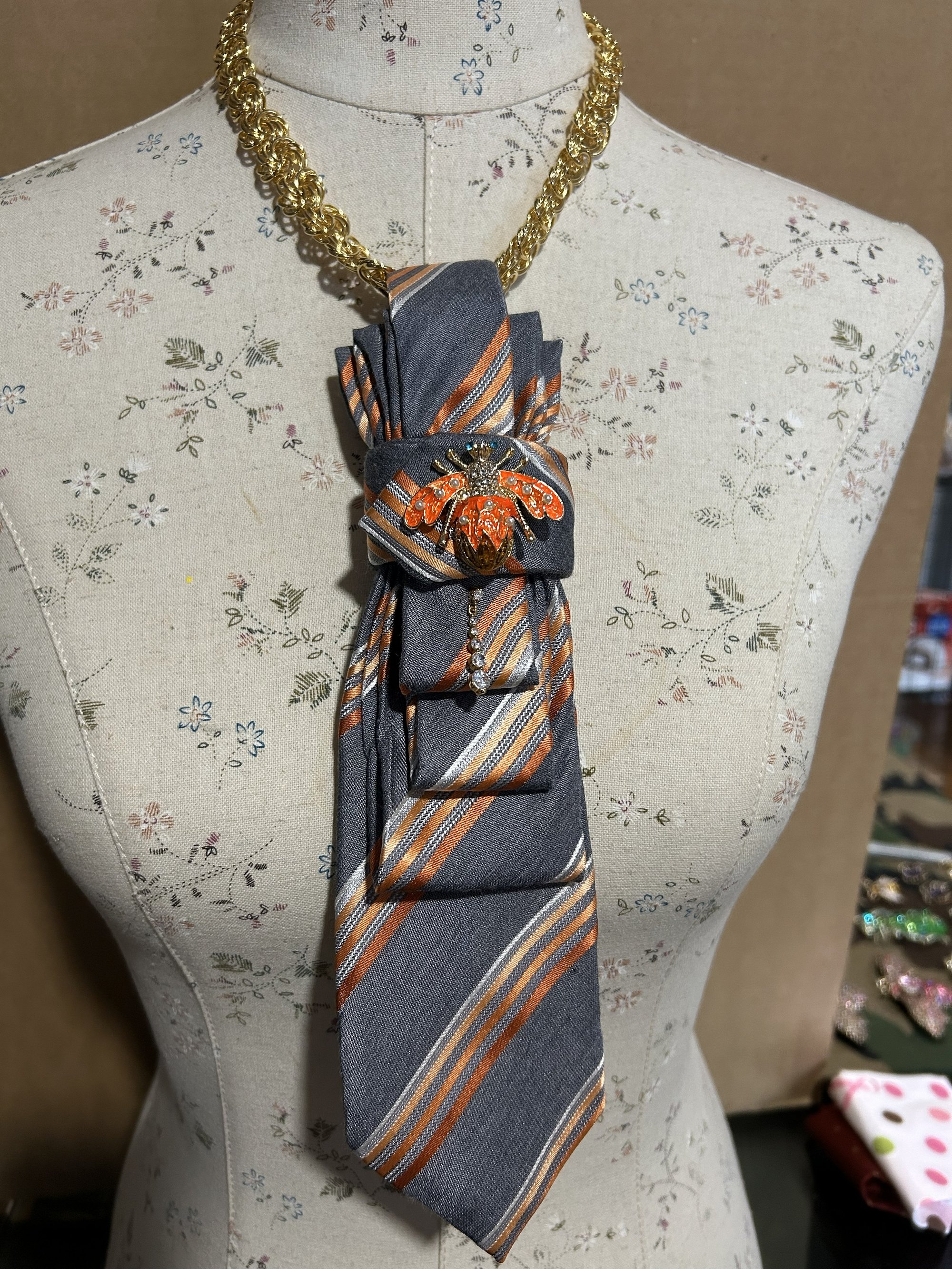 The Gilded Worker blends tailored elegance with symbolic strength. Crafted from a classic striped necktie in charcoal gray and warm copper tones, this piece features a bold bee embellishment at its center—representing diligence, resilience, and purpose. The structured folding highlights the tie’s original craftsmanship while transforming it into a powerful unisex statement accessory.