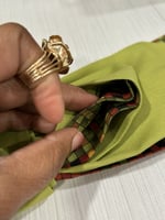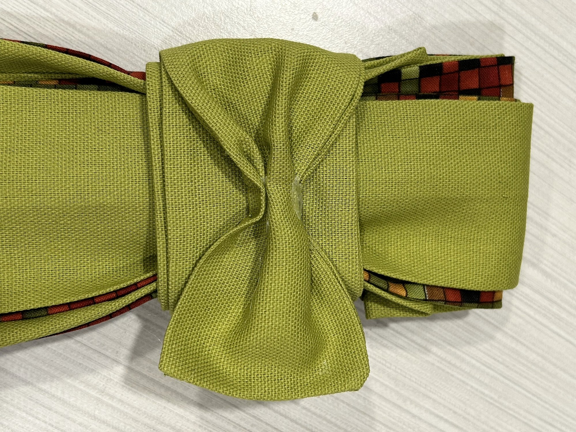 Handcrafted from carefully selected textiles, the Verdant Mosaic Bow features a structured moss-green exterior with a vibrant geometric lining revealed through intentional layering. Each fold is shaped by hand, making every piece subtly unique. Designed for the woman who values artistry, balance, and originality in what she wears.